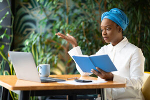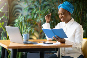 Black woman wearing blue turban holding book and looking at laptop sitting at table with coffee cup in cafe