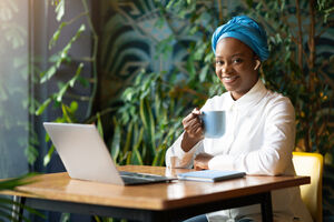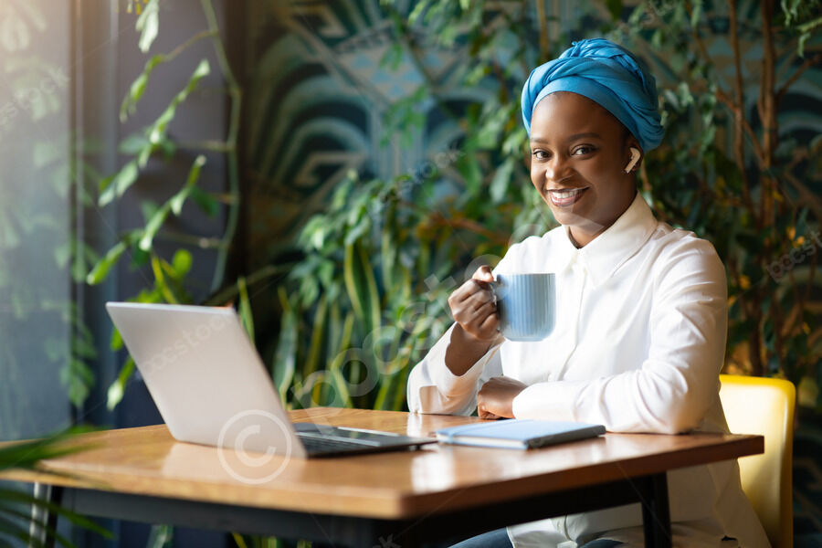 Smiling Black woman wearing blue turban and earphones holding coffee cup sitting at table with laptop and notebook in cafe