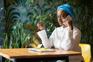 Black woman wearing blue turban holding eyeglasses while having phone call sitting at table with notebook in cafe
