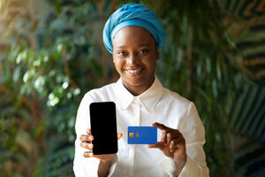 Smiling Black woman wearing blue turban showing smartphone and credit card in cafe