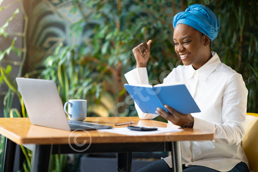 Cheerful Black woman with clenched fist wearing blue turban holding book and looking at laptop sitting at table with coffee cup in cafe