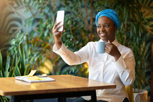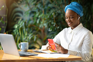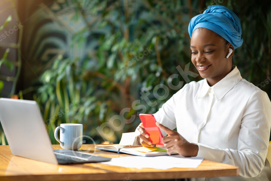Smiling Black woman wearing blue turban using smartphone sitting at table with laptop and coffee cup in cafe
