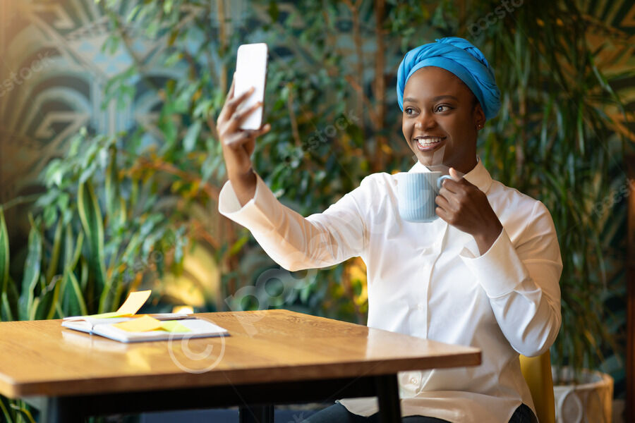 Cheerful Black woman wearing blue turban holding coffee cup and taking selfie on smartphone sitting at table with notebook in cafe