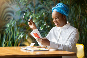 Black woman wearing blue turban and earphones holding eyeglasses sitting at table with laptop, notebook and coffee cup in cafe