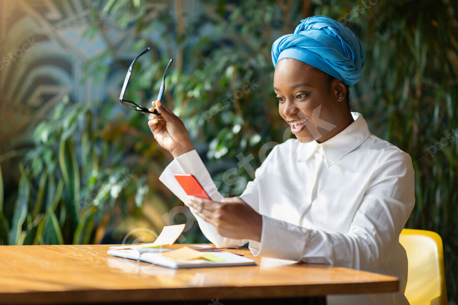 Cheerful Black woman with clenched fist wearing blue turban using smartphone sitting at table with notebook in cafe