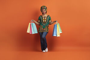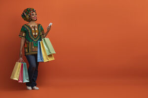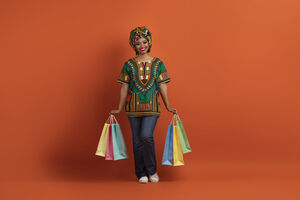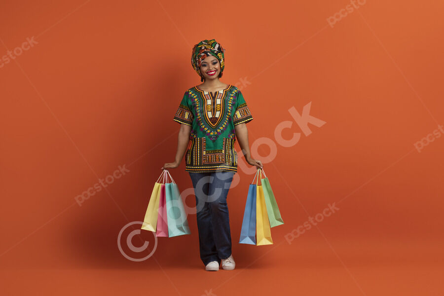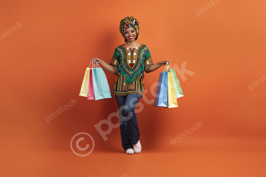 Black woman wearing dashiki and head wrap carrying shopping bags standing against orange wall in studio
