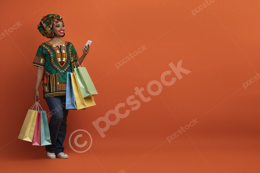 Black woman wearing dashiki and head wrap carrying shopping bags holding smartphone and looking away while standing against orange wall in studio
