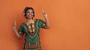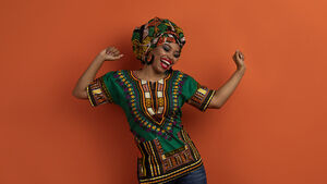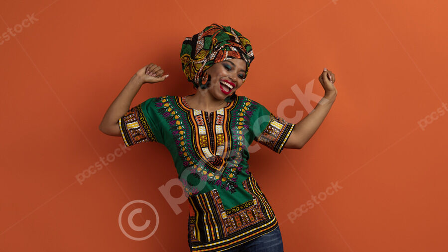 Black woman wearing dashiki and headwrap dancing against orange wall in studio