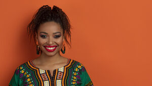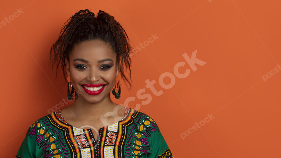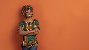 Black woman wearing dashiki and headwrap looking away standing against orange wall in studio