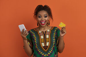 Cheerful Black woman wearing dashiki holding smartphone and credit card while standing against orange wall in studio