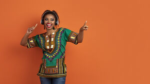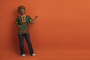 Black woman wearing dashiki and headwrap with both hands pointing up standing against orange wall in studio