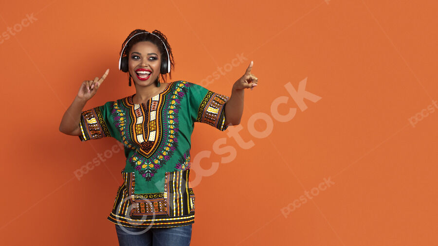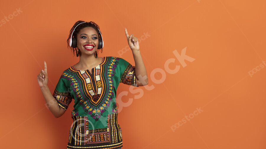 Black woman wearing dashiki listening to music with headphones looking away and dancing against orange wall in studio