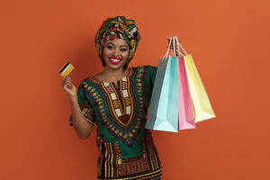 Black woman wearing dashiki and head wrap carrying shopping bags holding smartphone and credit card standing against orange wall in studio