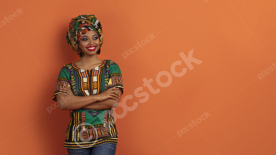 Black woman wearing dashiki and headwrap looking away standing with arms crossed against orange wall in studio
