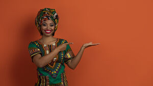 Black woman wearing dashiki and headwrap looking away with palms open while standing against orange wall in studio