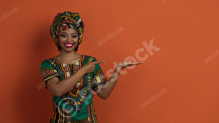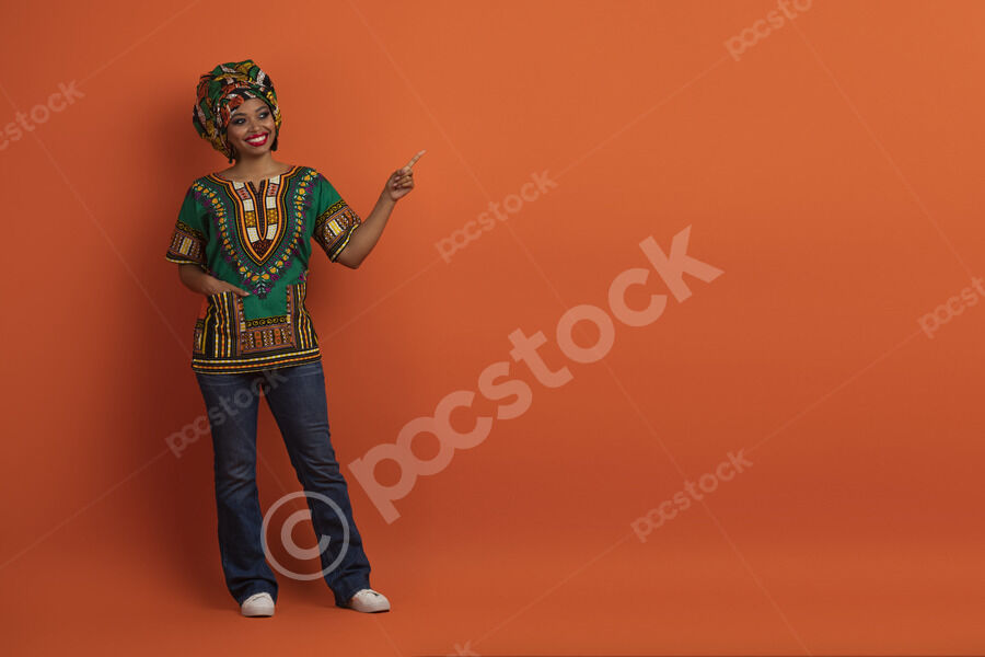 Black woman wearing dashiki and headwrap pointing at side standing against orange wall in studio