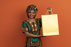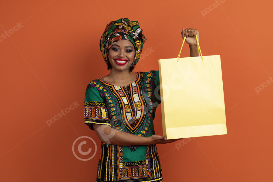 Black woman wearing dashiki and head wrap showing shopping bag standing against orange wall in studio