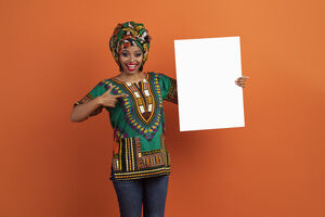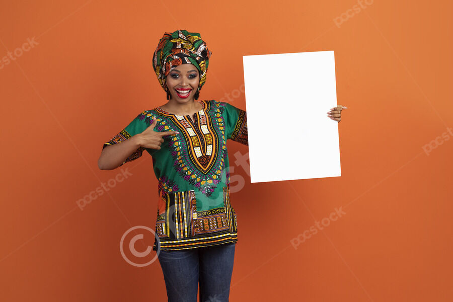 Black woman wearing dashiki and head wrap holding and pointing at white paper board standing against orange background in studio