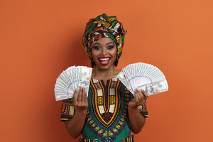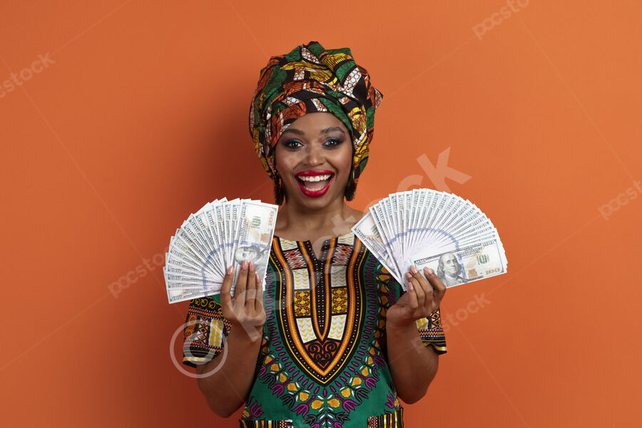 Black woman wearing dashiki and head wrap holding paper bills on both hands standing against orange wall in studio