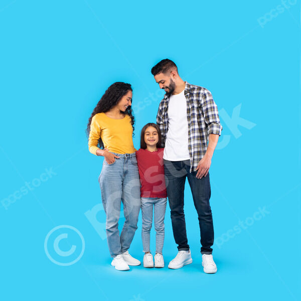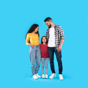 Arab parents looking at their daughter while standing together against blue background in studio