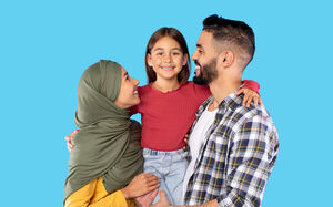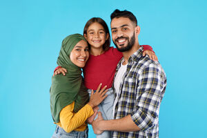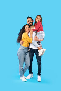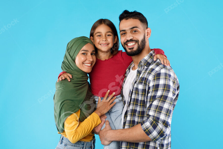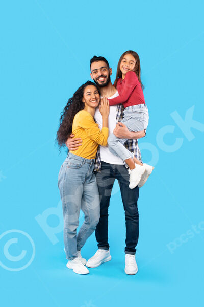 Arab parents carrying their daughter hugging while standing against blue background in studio