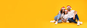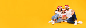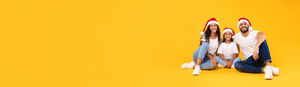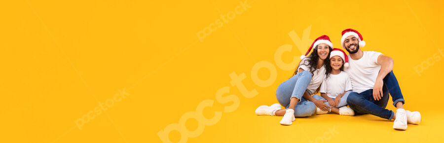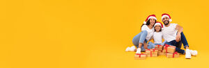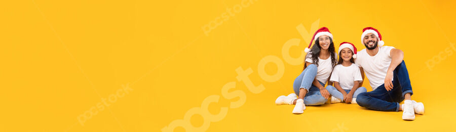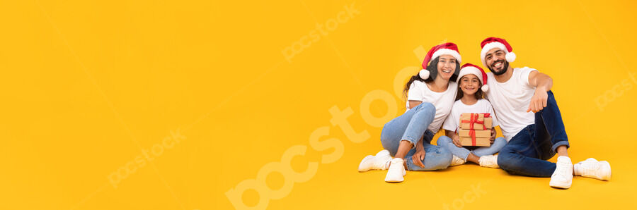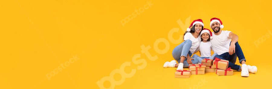 Arab family in white shirts and Santa hats sitting together on floor with gift boxes over yellow background in studio