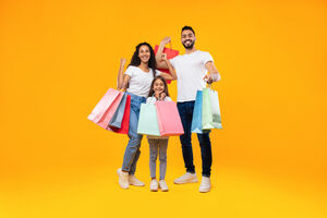 Arab family in white shirts holding shopping bags and smiling standing together against yellow background in studio