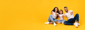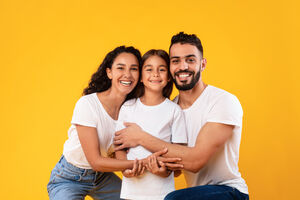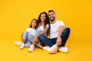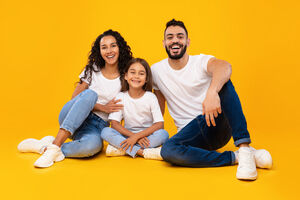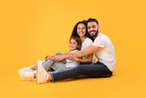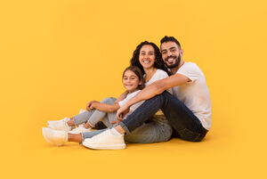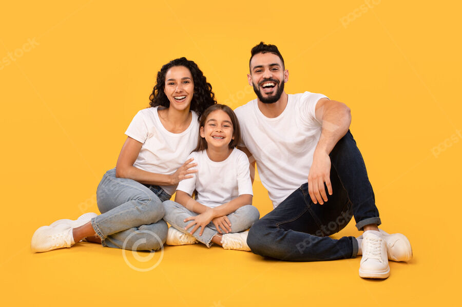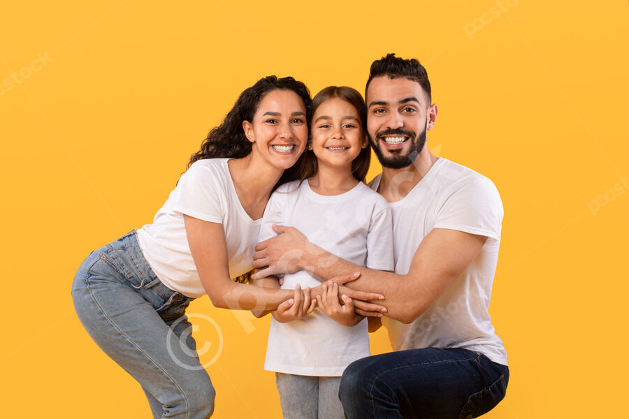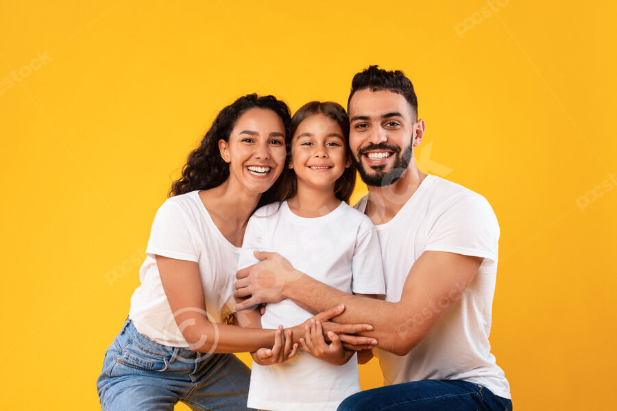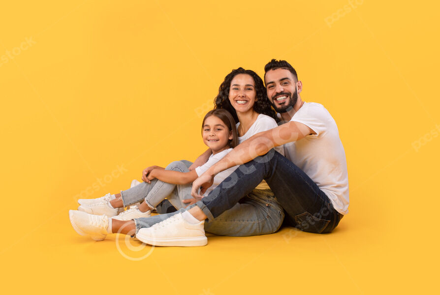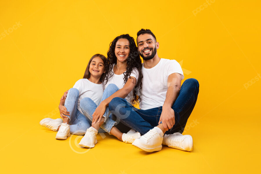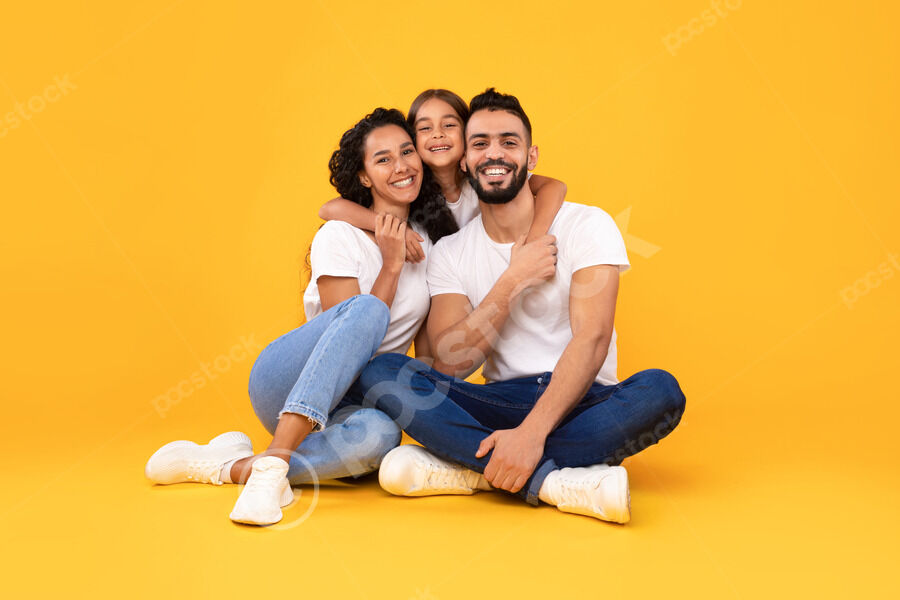Arab mother and father in white shirts embracing their daughter while crouching against yellow background in studio