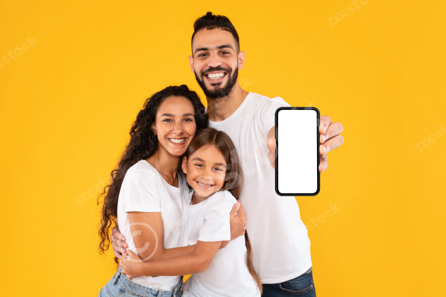 Arab family in white shirts showing smartphone with an empty screen and smiling while standing together against yellow background in studio