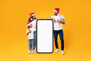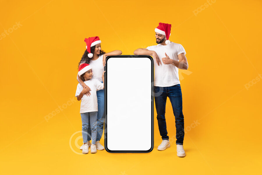Arab family in white shirts and Santa hats leaning on big smartphone with an empty white screen while standing against yellow background in studio