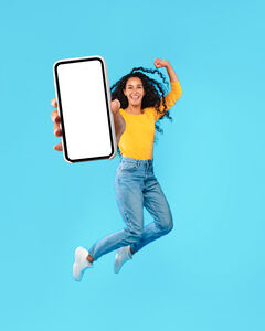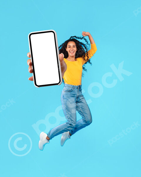 Arab woman with curly hair holding smartphone jumping with raised arm against blue background in studio