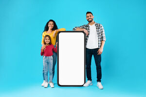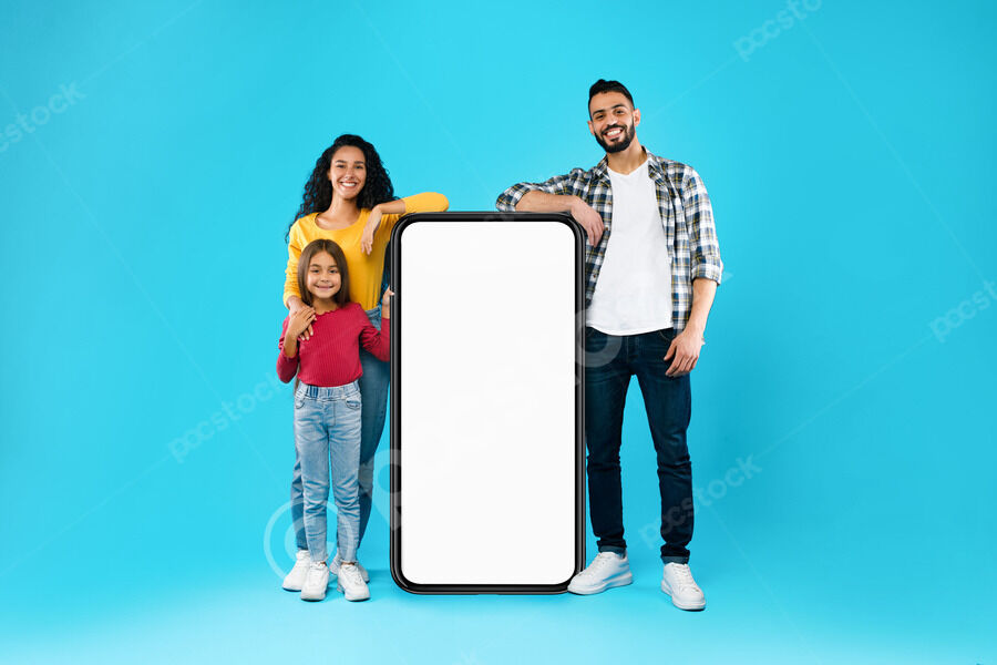 Arab family leaning at big smartphone with empty white screen while standing against blue background in studio