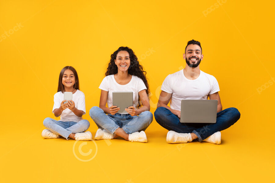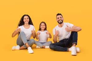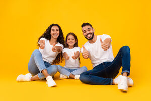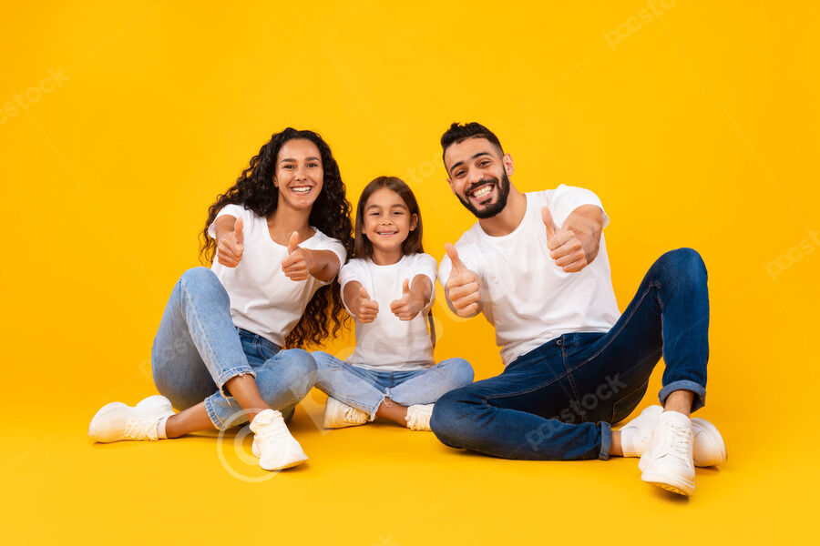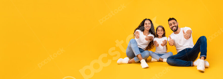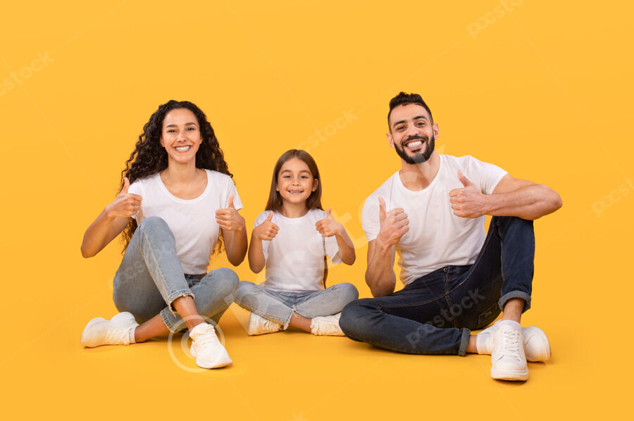 Arab family in white shirts giving thumbs up and smiling while sitting together on floor over yellow background in studio