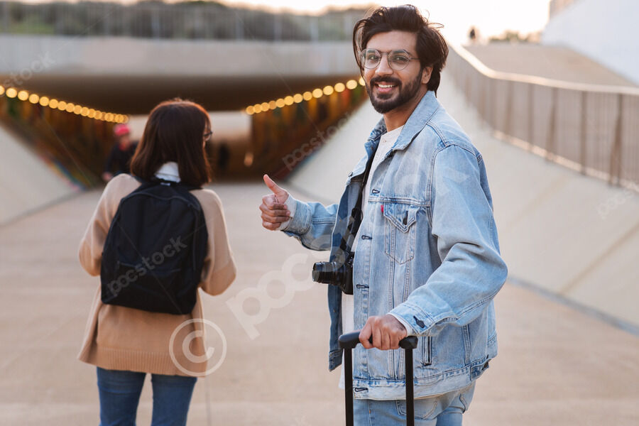 Asian man wearing eyeglasses showing thumbs up standing with luggage near caucasian wife waiting for taxi in city during daytime