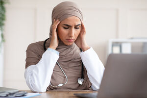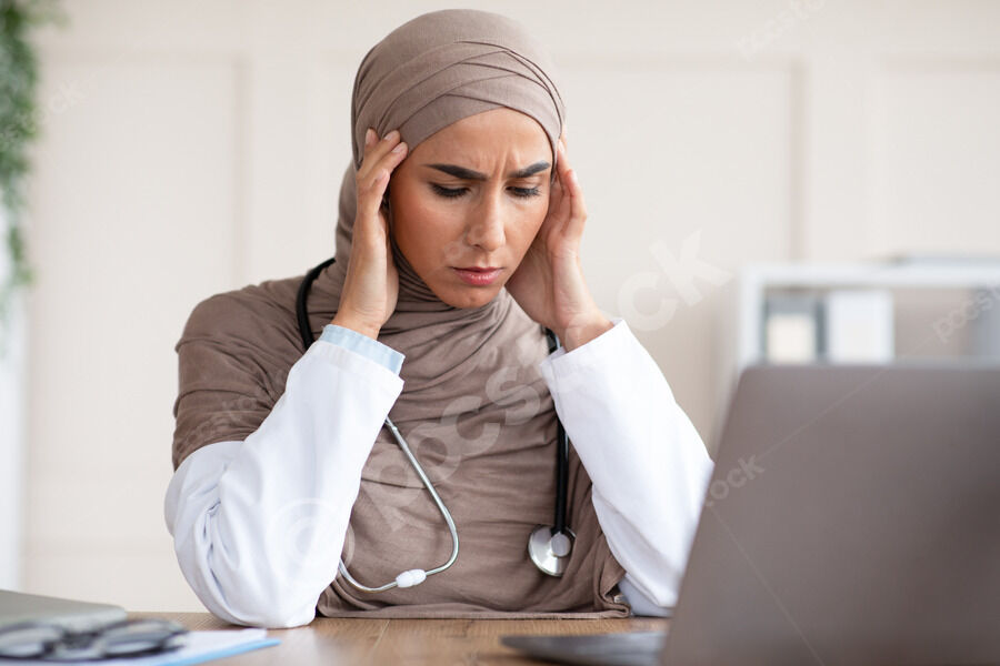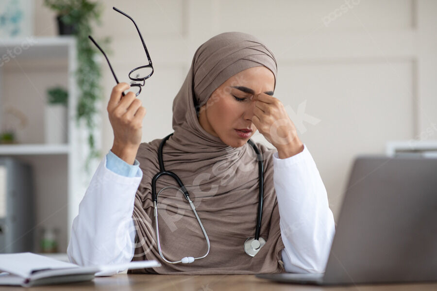 Exhausted Middle Eastern female doctor wearing hijab and stethoscope around her neck massaging her temples and looking down while sitting at table with laptop in clinic