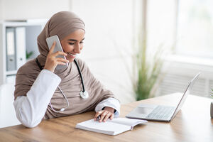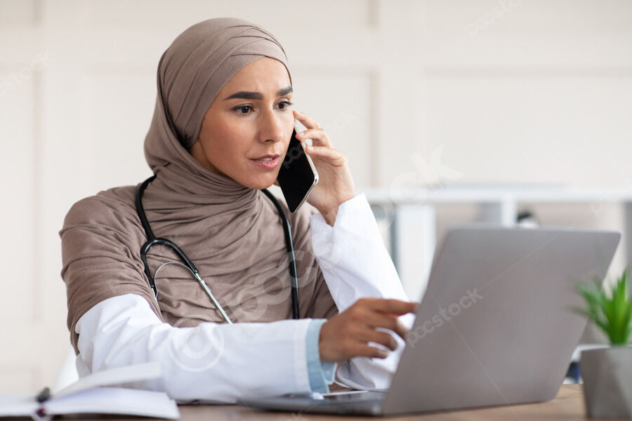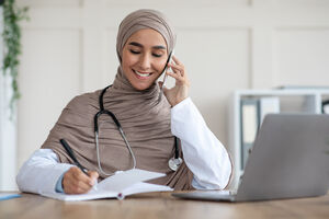 Middle Eastern female doctor wearing hijab and stethoscope around her neck talking on mobile phone and writing notes while sitting at table with laptop in clinic