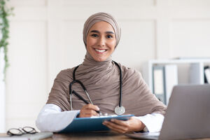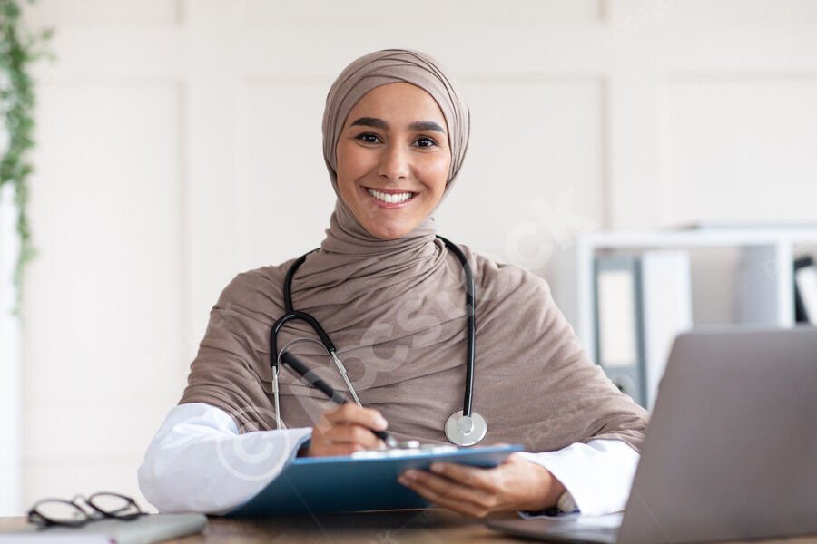 Smiling Middle Eastern female doctor with stethoscope aound her neck wearing hijab writing on medical chart sitting at table with laptop in clinic