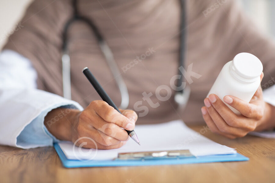 Cropped image of Middle Eastern female doctor wearing hijab and stethoscope around her neck writing prescription in medical chart and holding medicine bottle while sitting at table in clinic