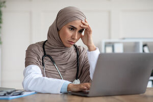 Exhausted Middle Eastern female doctor wearing hijab and stethoscope around her neck touching her temples and looking at laptop screen while sitting at table in clinic