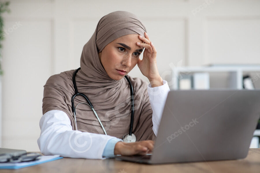 Exhausted Middle Eastern female doctor wearing hijab and stethoscope around her neck touching her forehead and looking at laptop screen while sitting at table in clinic