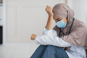 Exhausted Middle Eastern female doctor wearing hijab, face mask, and stethoscope around her neck leaning head on her hands while crouching in clinic