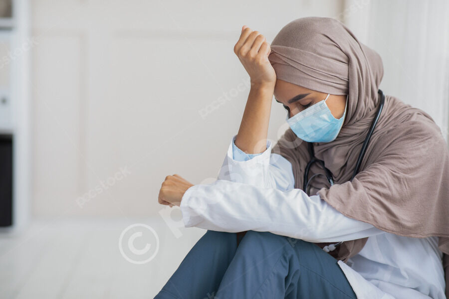 Exhausted Middle Eastern female doctor wearing hijab and face mask touching her forehead while sitting on floor in clinic