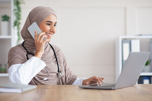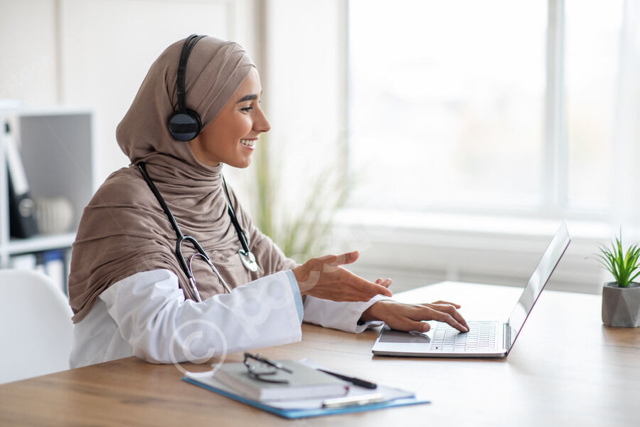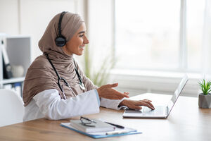 Middle Eastern woman wearing hijab, stethoscope around her neck, and headset having video conference with her patient using laptop while sitting at table in clinic