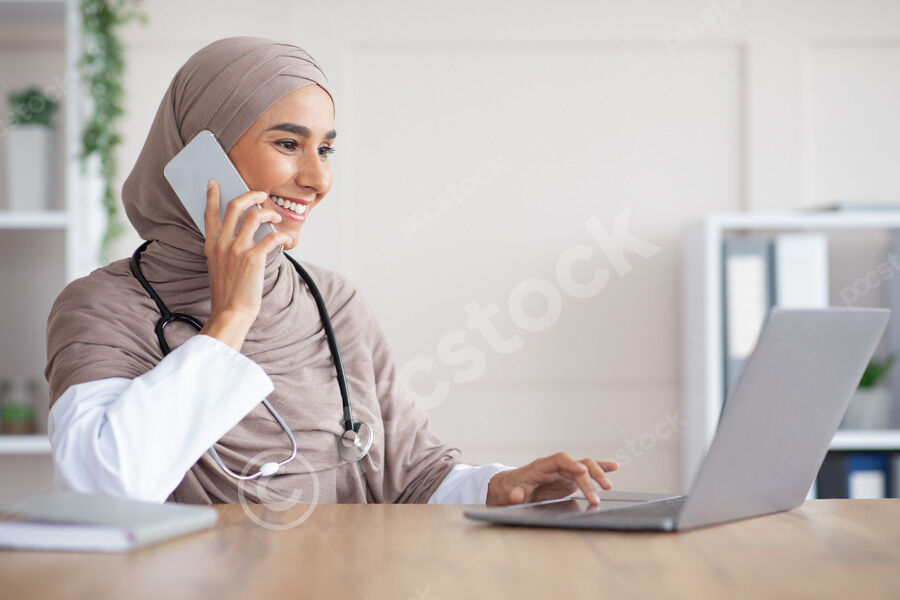 Middle Eastern female doctor wearing hijab and stethoscope around her neck talking on mobile phone and looking at laptop screen while sitting at table in clinic