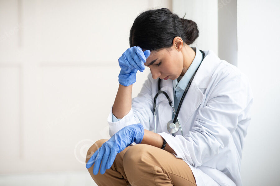 Middle Eastern female doctor wearing surgical gloves and face mask leaning head on her hand sitting on floor in clinic