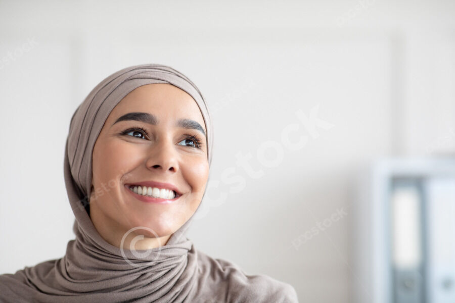 Middle Eastern woman wearing hijab smiling and looking away while standing indoors
