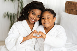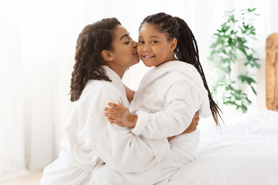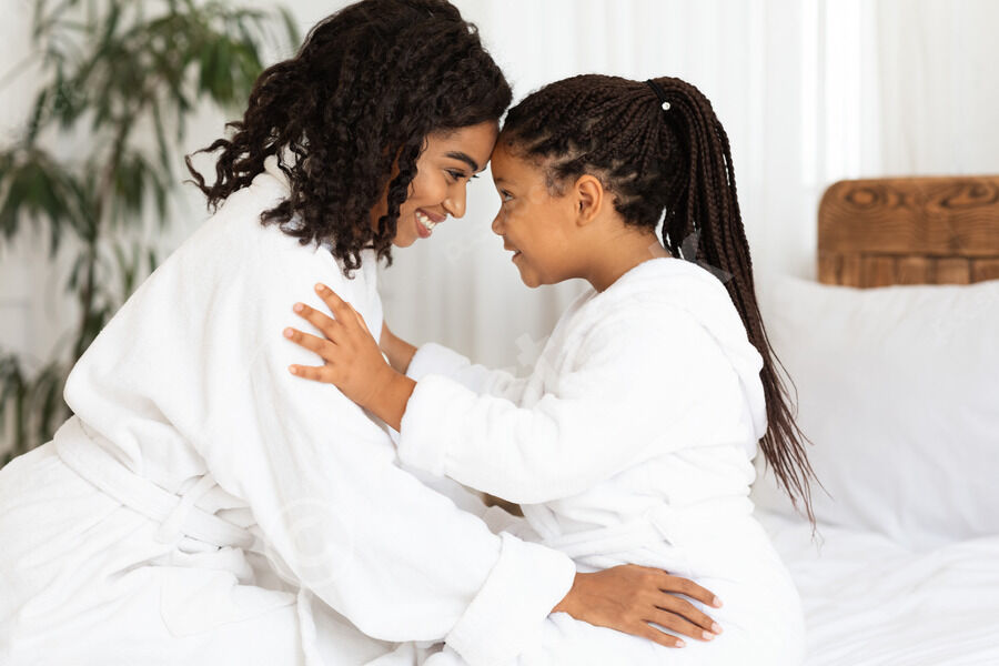Smiling Black mother and daughter in bathrobes touching each other's forehead while sitting together on bed at home