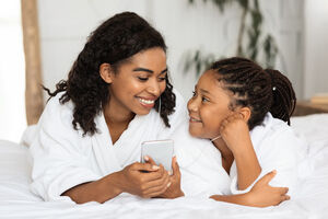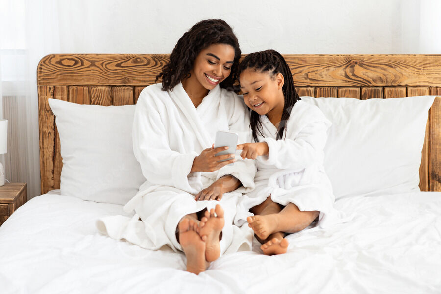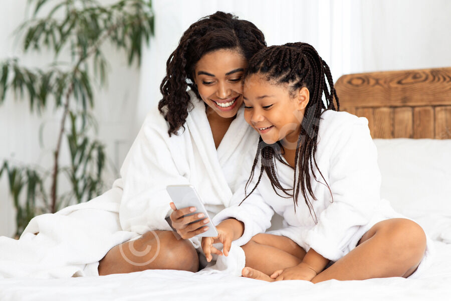 Cheerful Black mother and daughter in bathrobes looking at smartphone while sitting together on bed at home