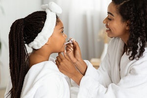 Smiling Black mother in bathrobe applying lip gloss to her daughter while sitting together on bed at home