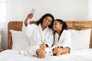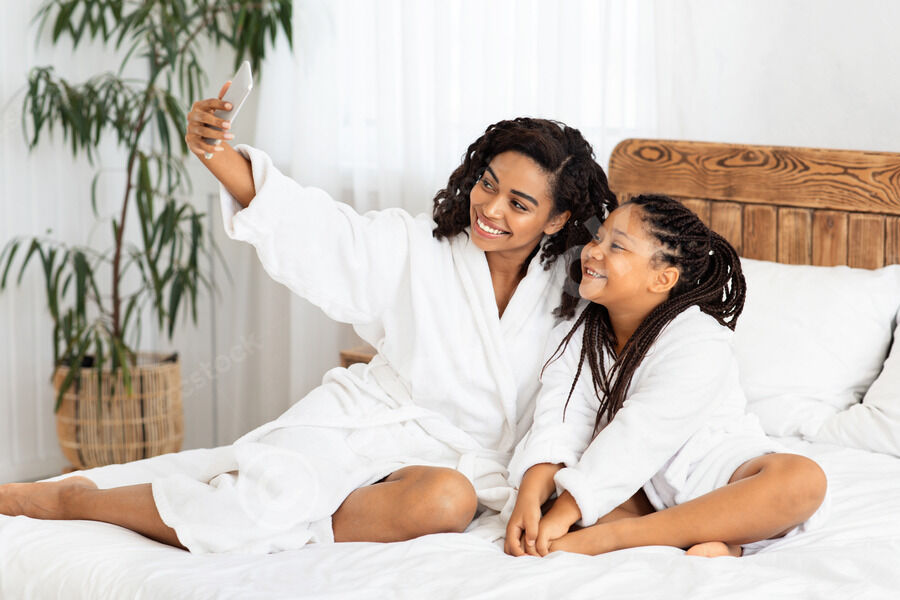Cheerful Black mother and daughter in bathrobes taking selfies using smartphone while sitting together on bed at home